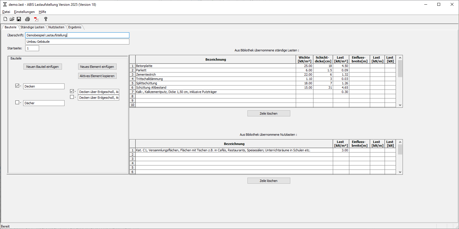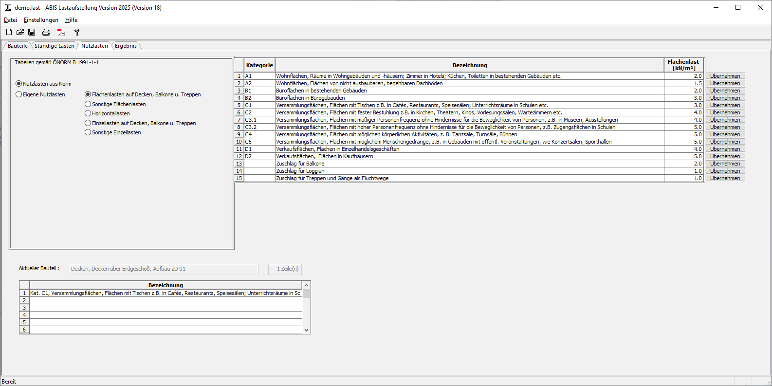 Mit diesem können Sie selbst definierten Bauteilen (Dächer, Decken, Wände etc.) sowohl ständige Lasten als auch Nutzlasten zuordnen.