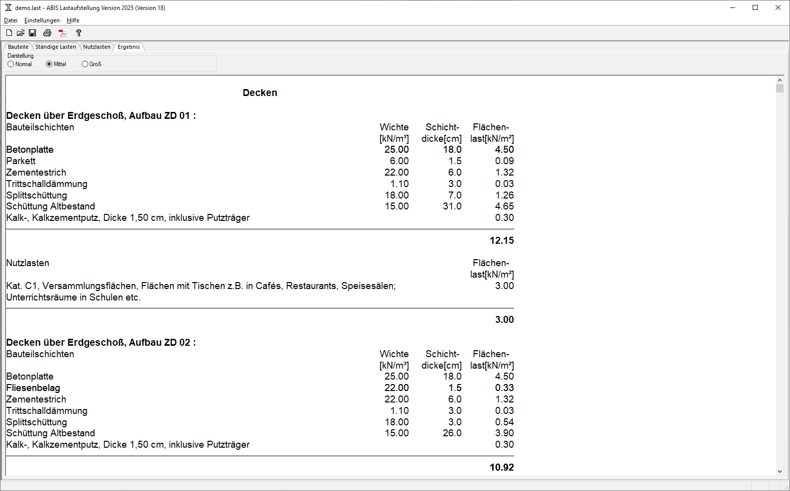 Die Liste der ständigen Lasten stammt aus der ÖNORM B 1991-1-1, Anhang A. Darüber hinaus können Sie noch eigene ständige Lasten und Nutzlasten definieren. Als Ergebnis erhalten Sie die je nach Bauteilelement (z.B. Flachdach, Steildach) summierten Flächenlasten - wenn vorhanden auch die Summen der Linien- und Einzellasten. Ein Demobeispiel sowie eine Onlinehilfe last.chm sind dabei.