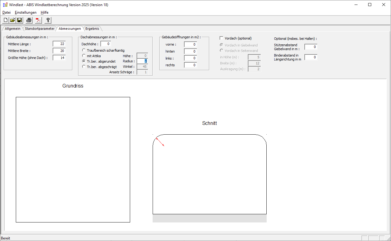 Bei der EN 1991-1-4 mit ihren nationalen Anhängen für Österreich und Deutschland kann nun bei Flachdächern ein abgeschrägter oder abgerundeter Traufbereich eingegeben werden.